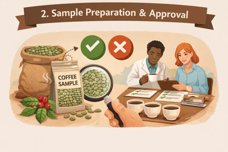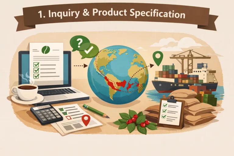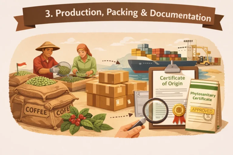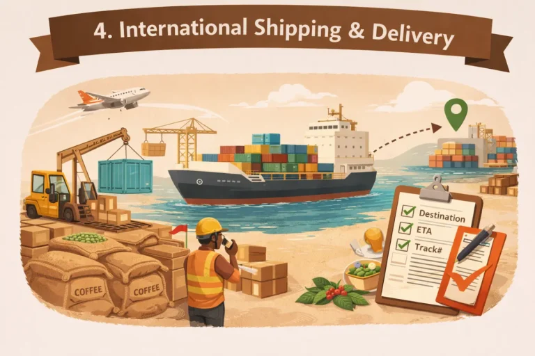 After confirmation, coffee beans are processed, packed, and prepared with complete export documentation.